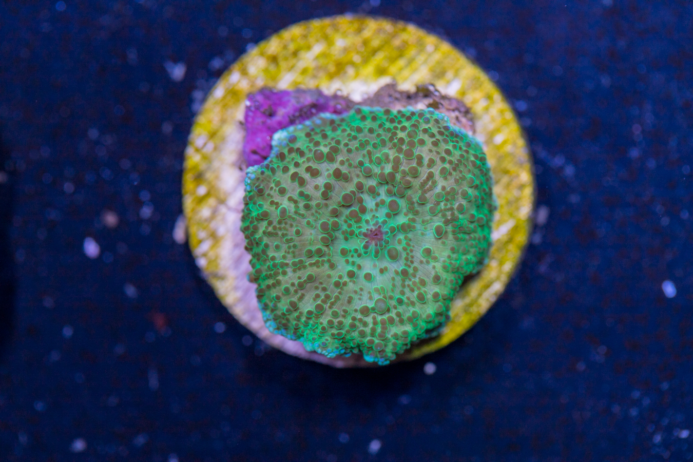Corals placed at the bottom of the tank thrive in lower flow and partially shaded areas. They can be placed on your sand bed or perhaps under a ledge.  We recommend that they get some light, but don’t need as much as other corals to live and grow.