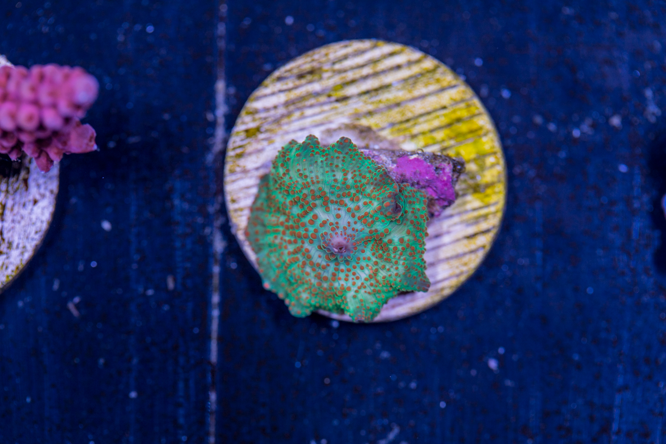 Corals placed at the bottom of the tank thrive in lower flow and partially shaded areas. They can be placed on your sand bed or perhaps under a ledge.  We recommend that they get some light, but don’t need as much as other corals to live and grow.