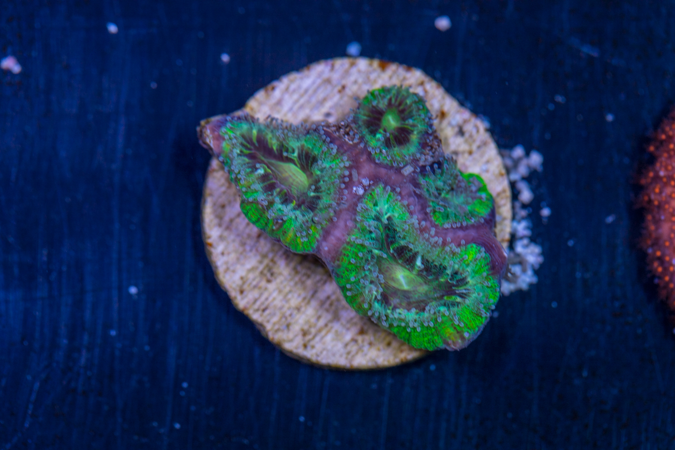 Corals placed at the bottom of the tank thrive in lower flow and partially shaded areas. They can be placed on your sand bed or perhaps under a ledge.  We recommend that they get some light, but don’t need as much as other corals to live and grow.