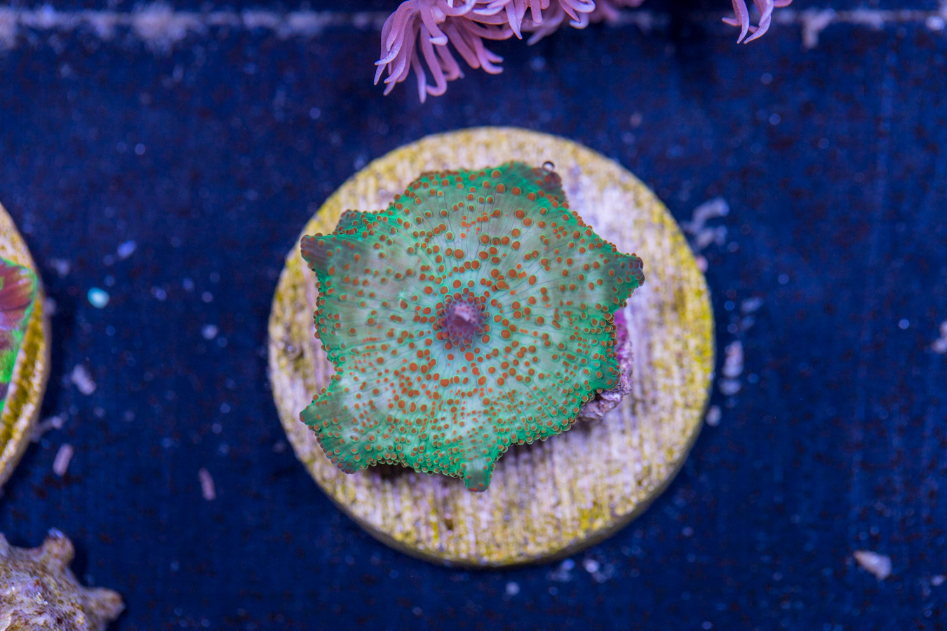 Corals placed at the bottom of the tank thrive in lower flow and partially shaded areas. They can be placed on your sand bed or perhaps under a ledge.  We recommend that they get some light, but don’t need as much as other corals to live and grow.