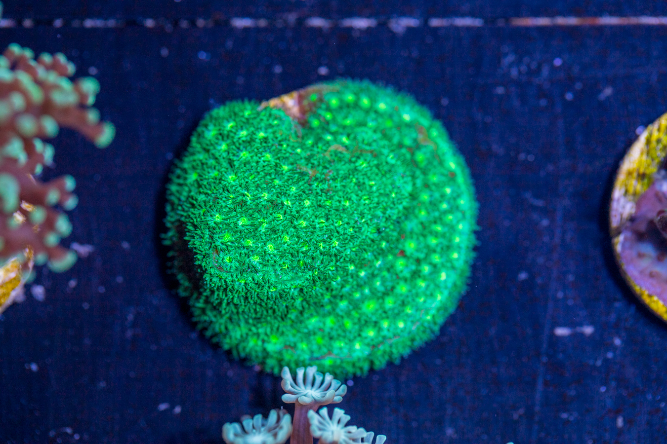 Corals placed at the bottom of the tank thrive in lower flow and partially shaded areas. They can be placed on your sand bed or perhaps under a ledge.  We recommend that they get some light, but don’t need as much as other corals to live and grow.