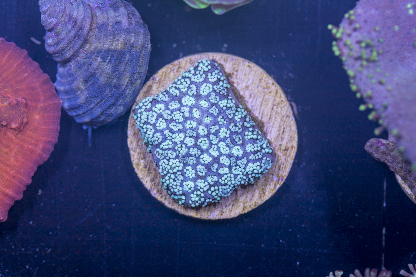 Corals placed at the bottom of the tank thrive in lower flow and partially shaded areas. They can be placed on your sand bed or perhaps under a ledge.  We recommend that they get some light, but don’t need as much as other corals to live and grow.