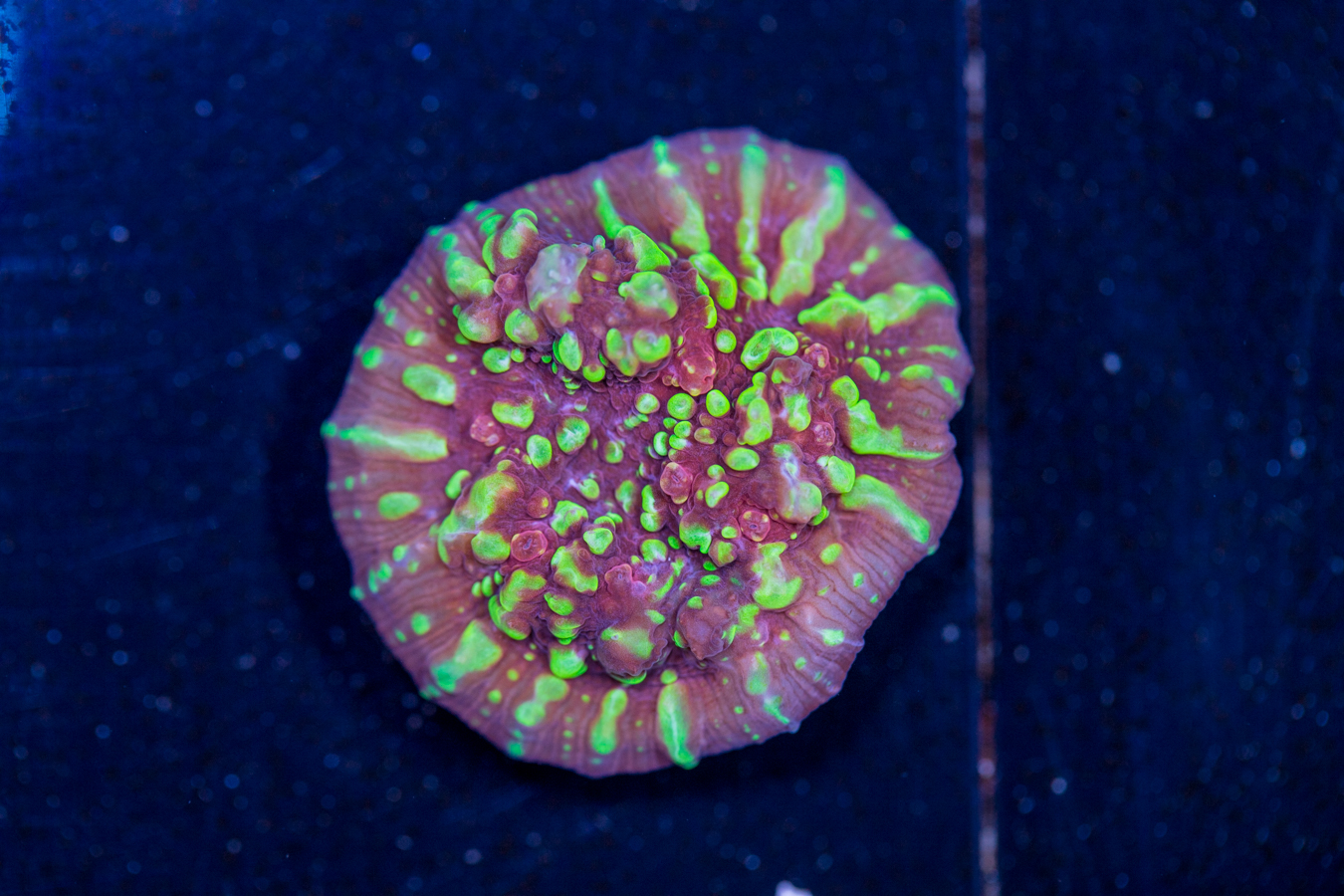 Corals placed at the bottom of the tank thrive in lower flow and partially shaded areas. They can be placed on your sand bed or perhaps under a ledge.  We recommend that they get some light, but don’t need as much as other corals to live and grow.
