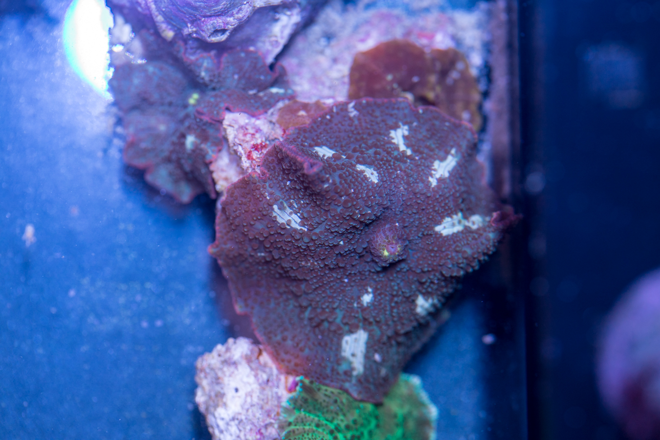 Corals placed at the bottom of the tank thrive in lower flow and partially shaded areas. They can be placed on your sand bed or perhaps under a ledge.  We recommend that they get some light, but don’t need as much as other corals to live and grow.