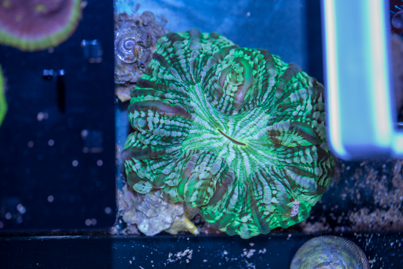 Corals placed at the bottom of the tank thrive in lower flow and partially shaded areas. They can be placed on your sand bed or perhaps under a ledge. We recommend that they get some light, but don’t need as much as other corals to live and grow.