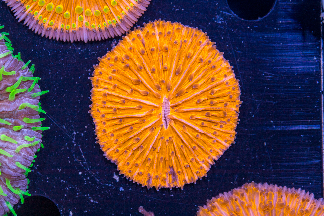 Corals placed at the bottom of the tank thrive in lower flow and partially shaded areas. They can be placed on your sand bed or perhaps under a ledge.  We recommend that they get some light, but don’t need as much as other corals to live and grow.