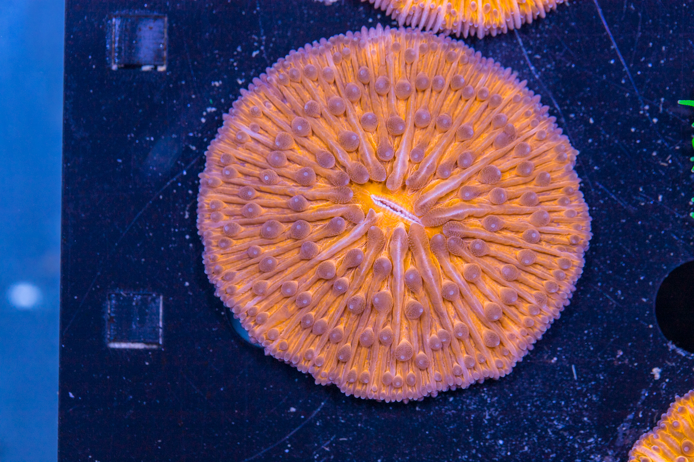 Corals placed at the bottom of the tank thrive in lower flow and partially shaded areas. They can be placed on your sand bed or perhaps under a ledge.  We recommend that they get some light, but don’t need as much as other corals to live and grow.