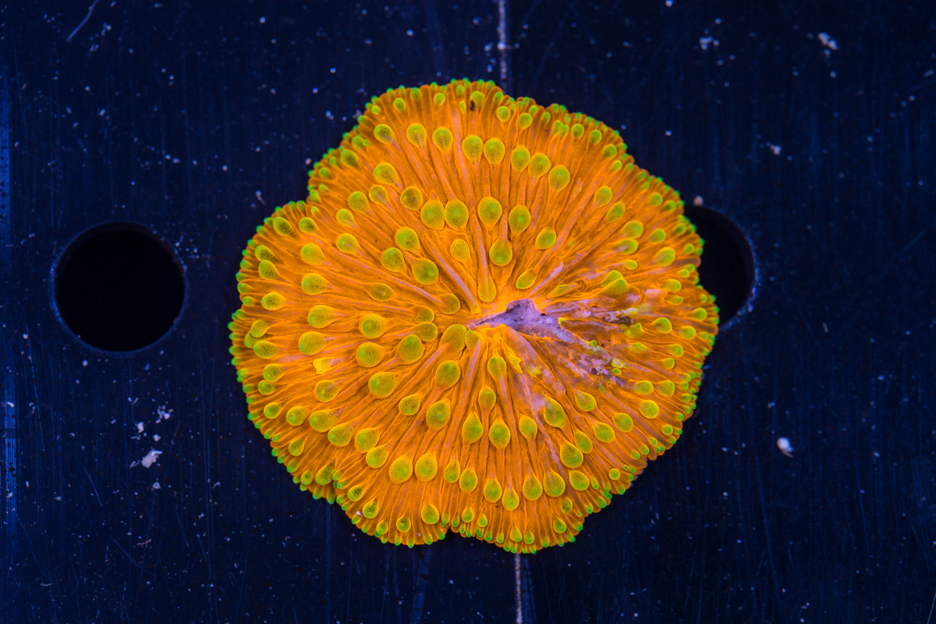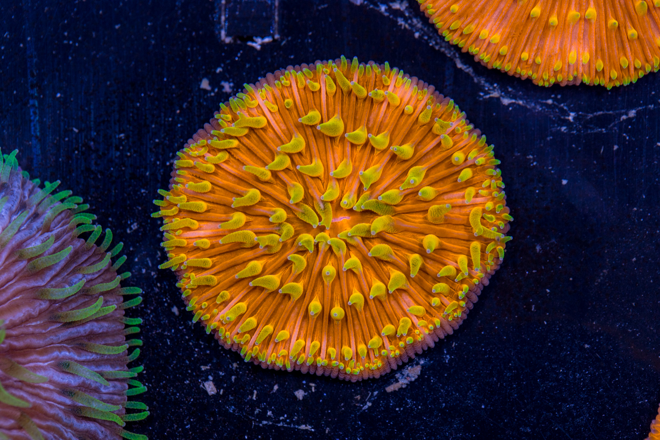 Corals placed at the bottom of the tank thrive in lower flow and partially shaded areas. They can be placed on your sand bed or perhaps under a ledge.  We recommend that they get some light, but don’t need as much as other corals to live and grow.