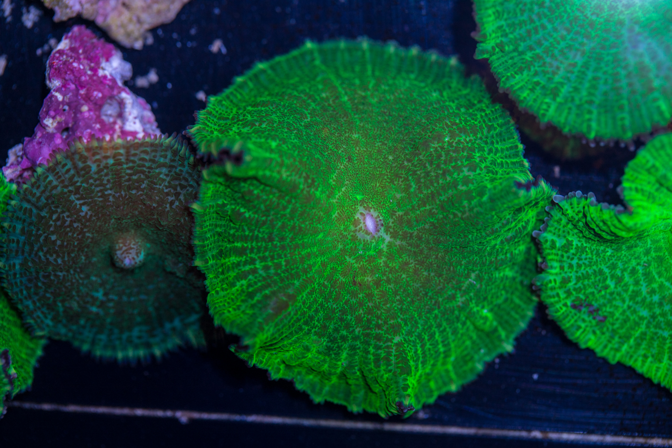 Corals placed at the bottom of the tank thrive in lower flow and partially shaded areas. They can be placed on your sand bed or perhaps under a ledge.  We recommend that they get some light, but don’t need as much as other corals to live and grow.