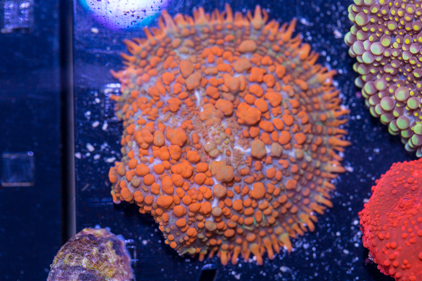 Corals placed at the bottom of the tank thrive in lower flow and partially shaded areas. They can be placed on your sand bed or perhaps under a ledge.  We recommend that they get some light, but don’t need as much as other corals to live and grow.
