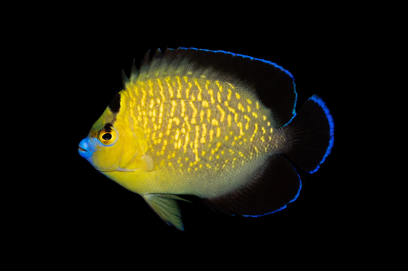 The Goldflake Angelfish displays beautiful gold spots throughout the body. The mouth region of this angel is brightly coloured in blue and the fins, which are black in colour, are bordered by a striking blue.