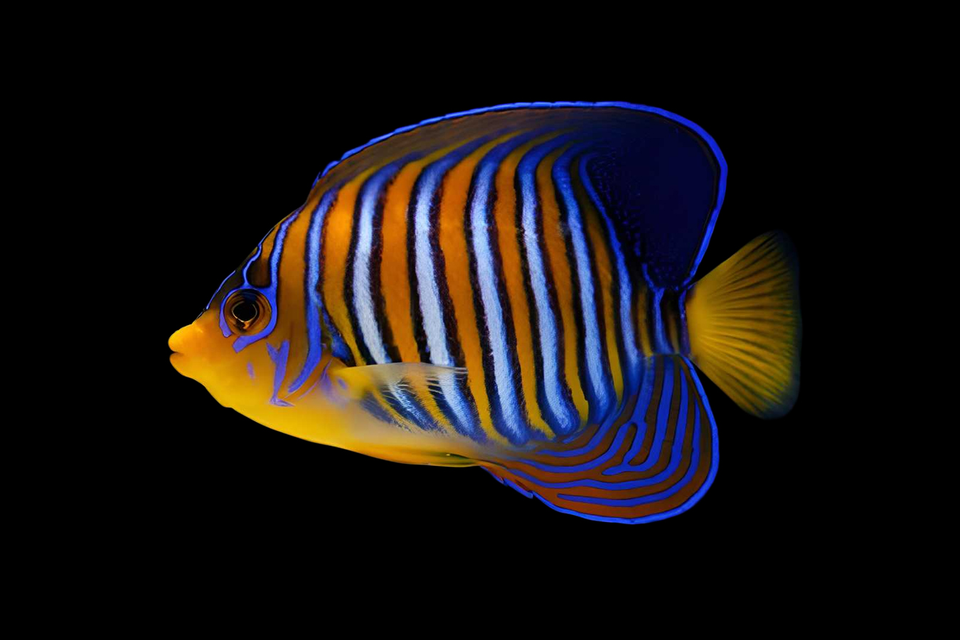 With vivid vertical striations of blue, white, yellow, or orange on the body and pelvic fin, the Regal Angelfish deserves this distinctive name. Regal Angelfish from the Maldives and the Red Sea have a distinctive yellow breast, where their Indo-Pacific, Coral Sea, New Caledonia and Tahitian relatives normally have a blue/gray breast. This coloration is more prevalent in specimens that are more mature and are at least 10cm in length. Juveniles will have a “False Eye Spot” on their dorsal fins that fades and the fish matures.