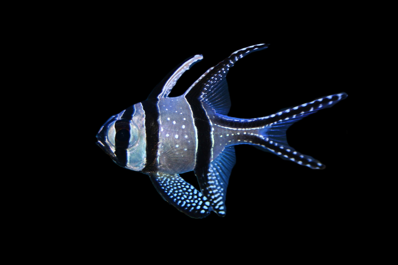 The Bangaii Cardinal is a very attractive fish with a simple yet sophisticated colour scheme and markings. Its overall body colouration is a shimmering silver, highlighted with pearly white spots. Bold, black stripes along the body accentuate the long fins.