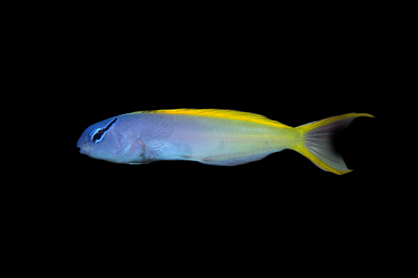 The Yellowtail Fangblenny has a pale blue that runs into yellow at the tail.