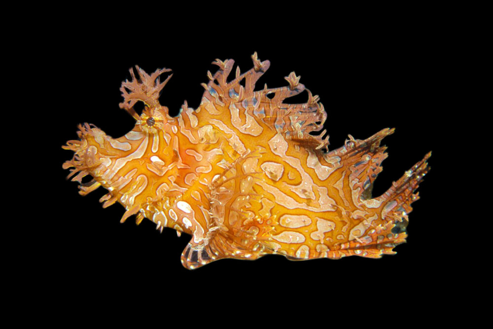 The Rhinopias Scorpionfish range in colouration from red, pink, purple or yellow depending on its environment. In an aquarium, it will often rock back and forth resembling a leaf in the water. It is an unusual and exotic fish, not one for beginners.