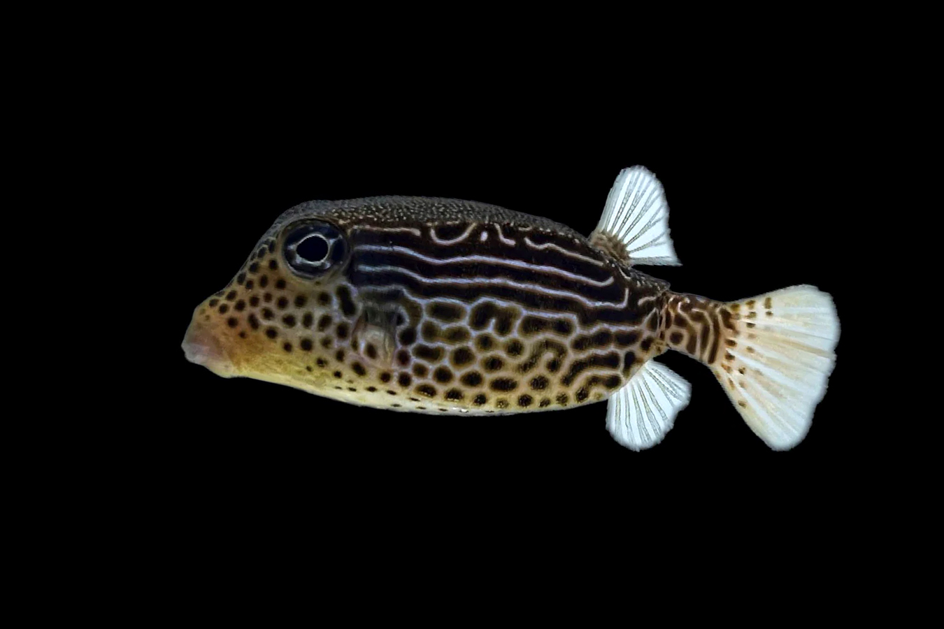 The Scribbled Boxfish has an attractive spotted and scribbled pattern, with males being differentiated from females by a black base colour and bluish markings.
