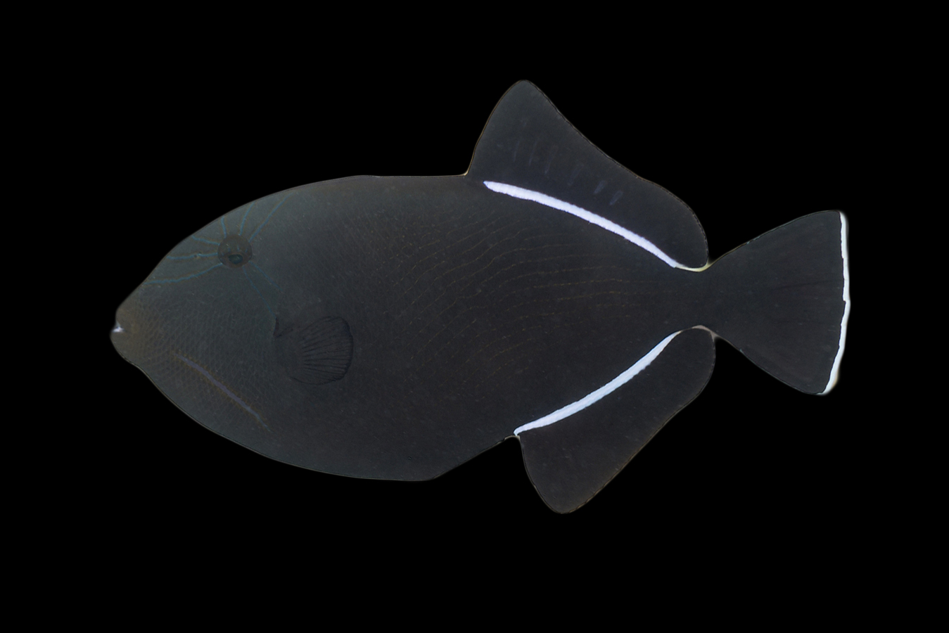The Indian Triggerfish is a beautiful jet black colour with white markings around its tail