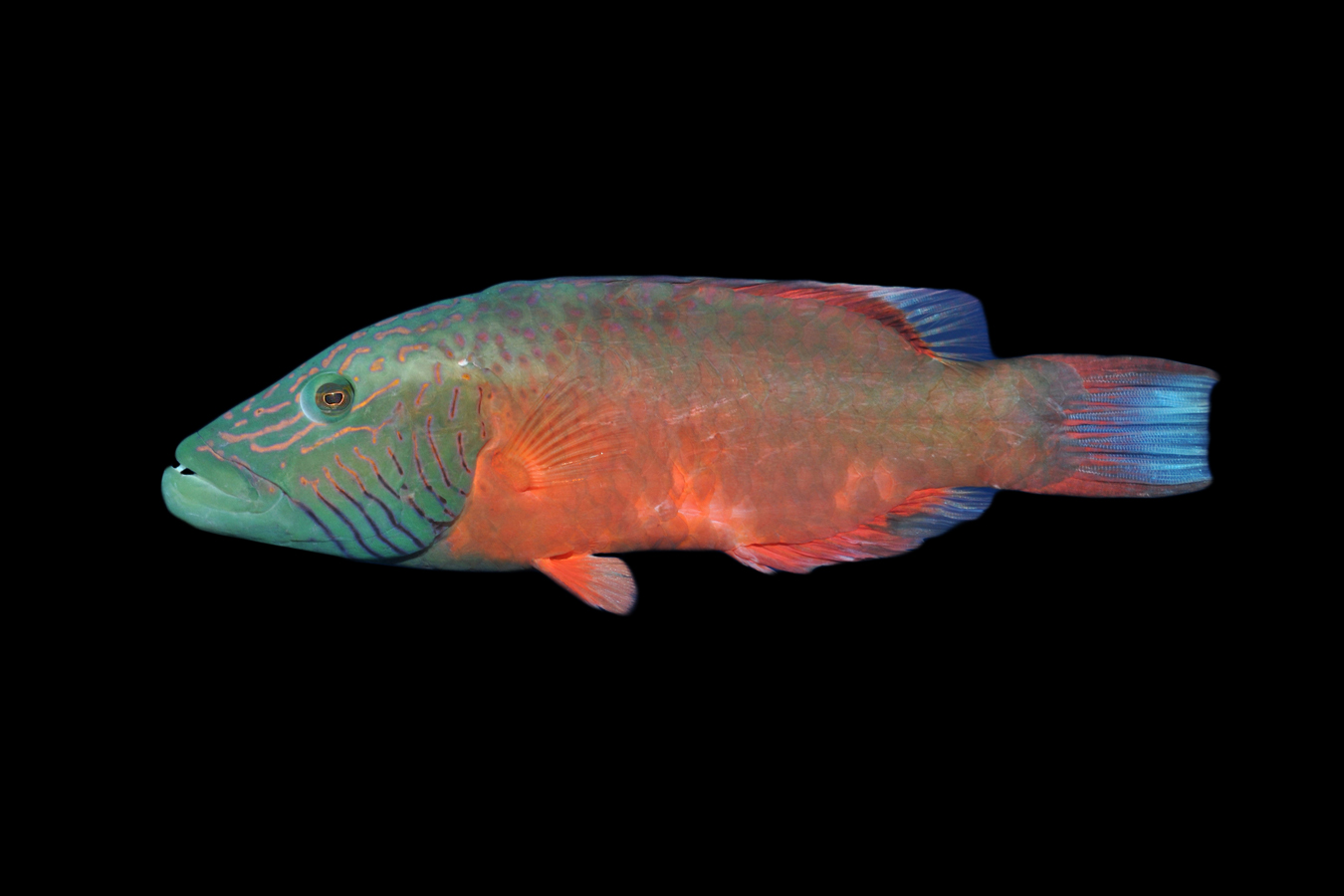 The Cheek Lined Maori Wrasse can be recognised by its colouration. Adults are reddish with a green red