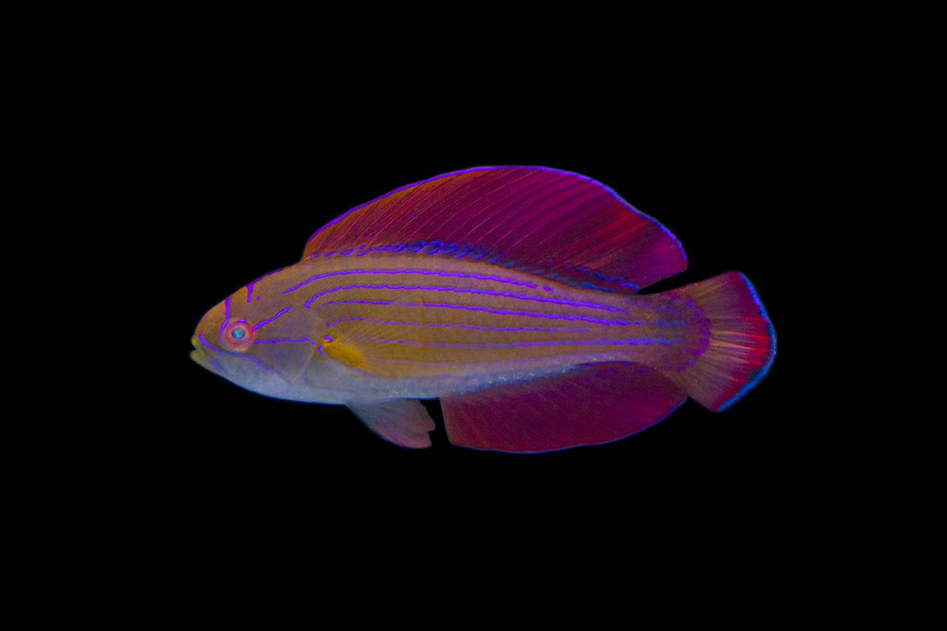 The Eightline Flasher Wrasse is a remarkably coloured wrasse featuring different hues of yellow, orange and red. The distinguishing feature of this fish are the eight striking blue lines that run horizontally along the length of the fish. Colours may vary depending on the fish’s mood.